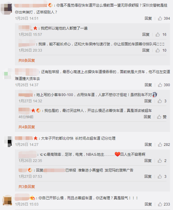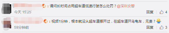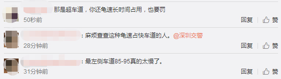 1月28日下午5點(diǎn),深圳交警在微博上也給網(wǎng)友作出回復(fù),對(duì)于長(zhǎng)時(shí)間龜速占用超車(chē)道的行為也將一并調(diào)查。