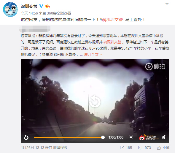 1月28日下午3點(diǎn),深圳交警在微博回復(fù)該網(wǎng)友稱馬上查處,并希望爆料博主能提供具體的時(shí)間。