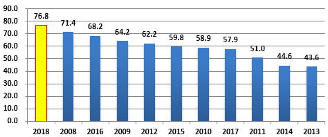 根據(jù)全市區(qū)域自動氣象站臺風(fēng)風(fēng)雨影響綜合年景指數(shù)計算結(jié)果,2018年臺風(fēng)風(fēng)雨影響綜合年景指數(shù)達(dá)到76.8,成為2008年以來最嚴(yán)重的一年,超過2008年的71.4。