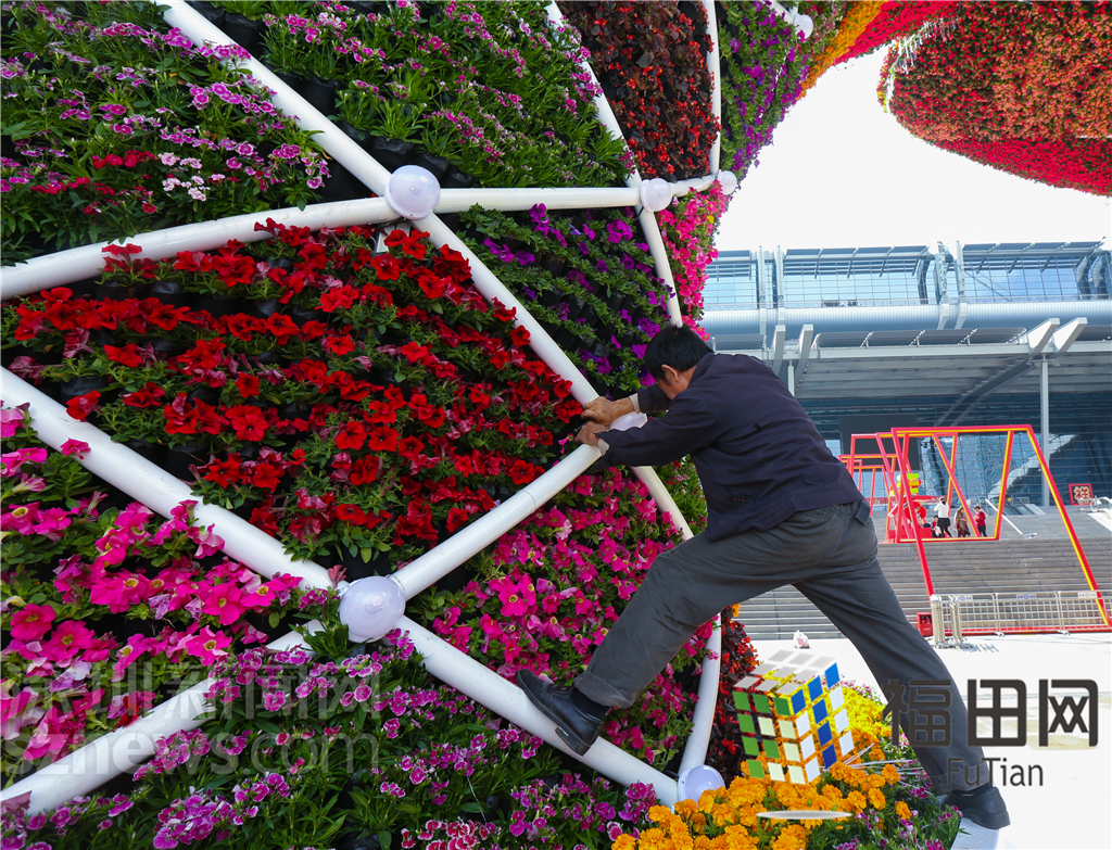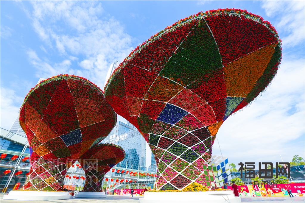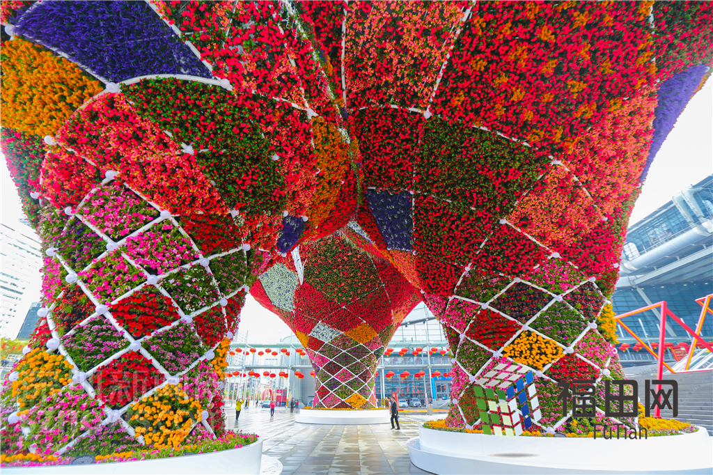 在會展中心門口,首先映入眼簾的便是一座高15米,寬40米的迎春花市門樓。記者了解到,該門樓本身就是一件花卉藝術(shù)作品,主題為——花開鵬城。以盛開抽象的花形為設(shè)計(jì)元素,采用流暢的交織曲線并結(jié)合七彩花卉,打造一種花開鵬城的韻味,突出迎春花市的氣息。