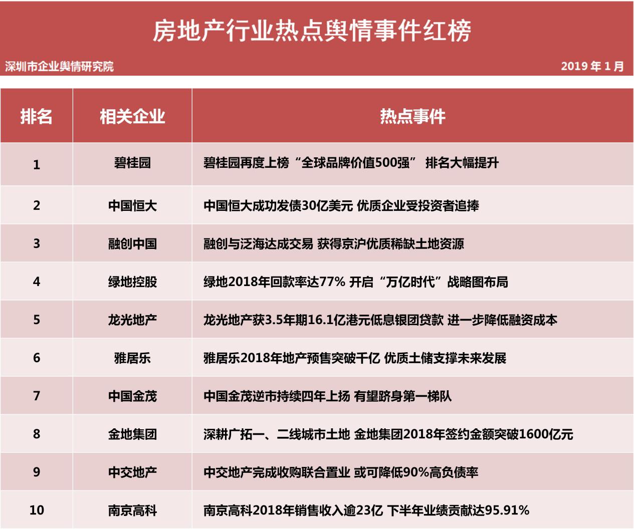 深圳新聞網(wǎng)2019年1月31日訊 (記者田志強(qiáng) 通訊員陳文光)1月31日,深圳企業(yè)輿情研究院發(fā)布第十二批企業(yè)輿情榜單。本次榜單重點(diǎn)聚焦房地產(chǎn)及醫(yī)藥保健兩個(gè)行業(yè)。房地產(chǎn)行業(yè)企業(yè)輿情榜單由房地產(chǎn)行業(yè)熱點(diǎn)輿情事件排行榜(紅、黑榜)及房地產(chǎn)企業(yè)公眾形象排行榜組成。