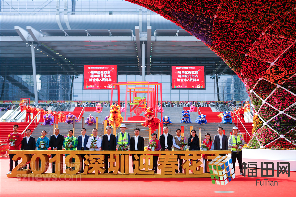 領(lǐng)導嘉賓向來深建設(shè)者贈送年花。
