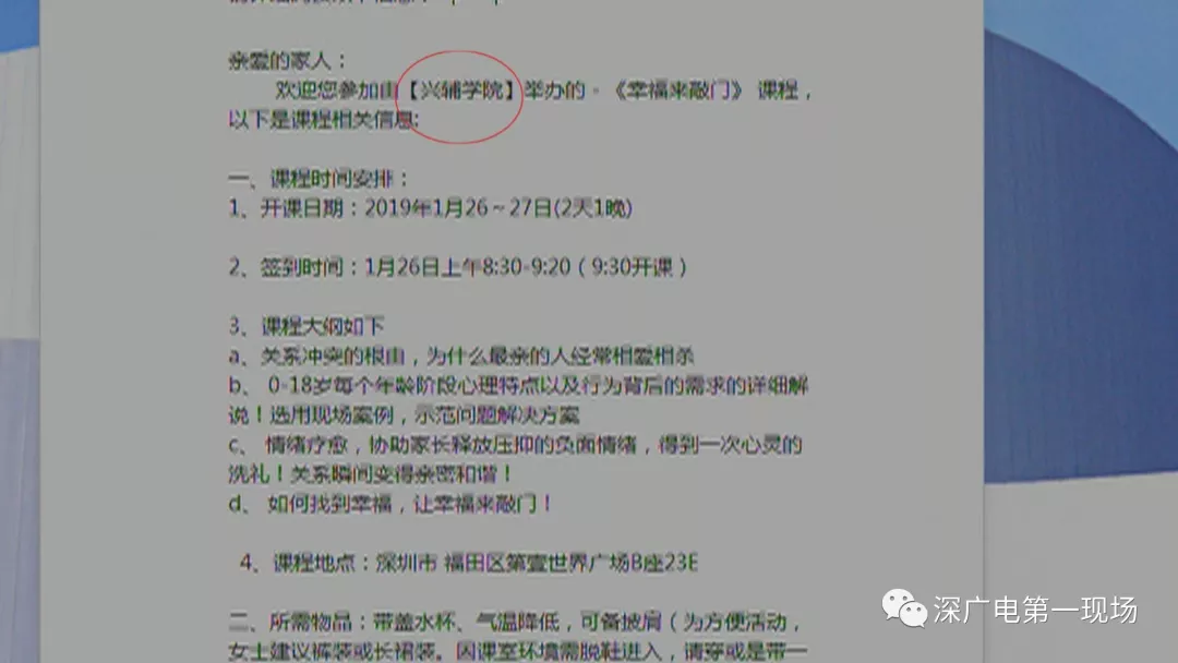 深廣電第一現(xiàn)場(chǎng)2019年2月1日訊 寒假前夕,龍華區(qū)不少家長(zhǎng)向我們欄目反映,從上學(xué)期開始他們通過(guò)學(xué)校老師的介紹,接觸到了一個(gè)教育機(jī)構(gòu)。這個(gè)校外的培訓(xùn)機(jī)構(gòu),主要給家長(zhǎng)傳授親子教育和家庭相處的技巧,按說(shuō)這應(yīng)該是一件好事,可是一些家長(zhǎng)卻發(fā)現(xiàn),參加了一些課程之后,不光家庭關(guān)系沒(méi)有變好,反而帶來(lái)了不少家庭矛盾?