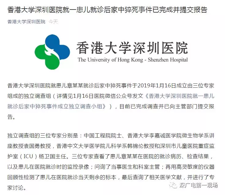 深廣電第一現(xiàn)場(chǎng)2019年2月1日訊 深圳8歲女孩患病前往香港大學(xué)深圳醫(yī)院就診,醫(yī)院兩次診斷均是上呼吸道感染,但孩子遵照醫(yī)囑吃完藥后病情并沒(méi)有好轉(zhuǎn)。在1月3日上午突然惡化,經(jīng)搶救無(wú)效死亡。 1月16日,香港大學(xué)深圳醫(yī)院發(fā)布消息稱(chēng),香港大學(xué)深圳醫(yī)院就患兒章某某就診后家中猝死事件成立獨(dú)立調(diào)查組。 1月31日,香港大學(xué)深圳醫(yī)院再次發(fā)布消息,稱(chēng)就患兒就診后家中猝死事件已完成調(diào)查并提交報(bào)告。全文如下: 香港大學(xué)深圳醫(yī)院就患兒章某某就診后家中猝死事件于2019年1月16日成立由三位專(zhuān)家組成的獨(dú)立調(diào)查組(詳情見(jiàn)1月16日醫(yī)院微信公眾號(hào)發(fā)文《香港大學(xué)深圳醫(yī)院就一患兒就診后家中猝死事件成立獨(dú)立調(diào)查小組》),目前已完成調(diào)查并已向主管部門(mén)提交報(bào)告。 獨(dú)立調(diào)查組的三位專(zhuān)家分別是:中國(guó)工程院院士、香港大學(xué)李嘉誠(chéng)醫(yī)學(xué)院微生物學(xué)系講座教授袁國(guó)勇教授,香港中文大學(xué)醫(yī)學(xué)院兒科學(xué)系韓錦倫教授和深圳市兒童醫(yī)院重癥監(jiān)護(hù)室(ICU)楊衛(wèi)國(guó)主任。三位專(zhuān)家查看了患兒章某某在醫(yī)院的就診病歷、檢查結(jié)果,以及患兒在醫(yī)院就診時(shí)的監(jiān)控錄像;問(wèn)詢(xún)了當(dāng)事醫(yī)生和科室主管;再用高靈敏度的儀器回顧性檢測(cè)了患兒在醫(yī)院就診當(dāng)天剩余的標(biāo)本,最后查詢(xún)了相關(guān)醫(yī)學(xué)文獻(xiàn),并進(jìn)行了專(zhuān)家討論。 三位專(zhuān)家已出具了最終調(diào)查報(bào)告。報(bào)告確定了患兒感染的類(lèi)型,分析了患兒猝死的原因很可能為心源性并發(fā)癥,并為今后避免類(lèi)似事件再次發(fā)生提供了建議。報(bào)告指出醫(yī)院的診療過(guò)程符合專(zhuān)業(yè)規(guī)范。 2019年1月25日上午,醫(yī)院已將報(bào)告的內(nèi)容悉數(shù)告知患兒章某某家長(zhǎng),并對(duì)家長(zhǎng)進(jìn)行了慰問(wèn)。同日,醫(yī)院也將報(bào)告上報(bào)給了主管部門(mén)。 由于報(bào)告的部分內(nèi)容涉及患兒及其家人隱私,以及報(bào)告的部分內(nèi)容依據(jù)《中華人民共和國(guó)傳染病防治法》規(guī)定,醫(yī)院沒(méi)有權(quán)限向公眾公開(kāi),所以醫(yī)院無(wú)法公布報(bào)告全文。 醫(yī)院一直秉持公開(kāi)、專(zhuān)業(yè)、科學(xué)的方式處理這一個(gè)案,尋求真相,并依此對(duì)診療工作進(jìn)行持續(xù)改進(jìn),促進(jìn)醫(yī)學(xué)的進(jìn)步。醫(yī)院也正在等待第三方的尸檢結(jié)果。 最后,醫(yī)院對(duì)獨(dú)立調(diào)查組的三位專(zhuān)家致以誠(chéng)摯的謝意,感謝他們?cè)诙潭虜?shù)天時(shí)間內(nèi),認(rèn)真、細(xì)致、嚴(yán)謹(jǐn)?shù)赝瓿闪苏{(diào)查,并撰寫(xiě)了報(bào)告。 香港大學(xué)深圳醫(yī)院 2019年1月31日