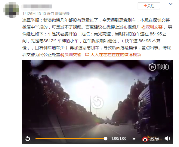 1月26日,有網(wǎng)友在微博爆料稱自己的車(chē)在高速上遇到惡意別車(chē),并@深圳交警