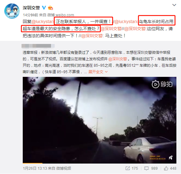 1月28日,深圳交警在微博回復(fù)該網(wǎng)友稱馬上查處,并希望爆料博主能提供具體的時(shí)間