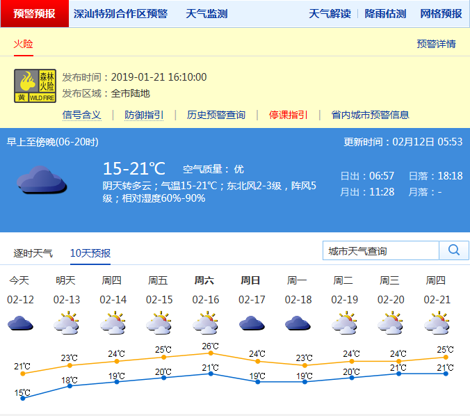 記者從深圳市氣象局了解到,昨日受冷空氣影響,早晨最低氣溫在14-16℃,較春節(jié)假期明顯變涼,因為云量較多,白天氣溫在17℃左右徘徊;預(yù)計12日起冷空氣逐漸減弱,氣溫逐日上升,早晚能見度逐漸轉(zhuǎn)差,氣溫在15-21℃;15-16日多云間晴天,早晚有輕霧或霧,中午前后較熱;17-18日弱冷空氣影響,有分散小雨,氣溫下降,沿海和高地陣風(fēng)7-8級。
