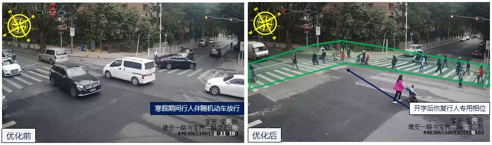 為保障校園周邊學(xué)生過(guò)街安全,深圳交警在校園周邊人流量密集的路口設(shè)置行人專用相位及行人綠波,開(kāi)學(xué)期間共優(yōu)化行人過(guò)街路口94個(gè)。