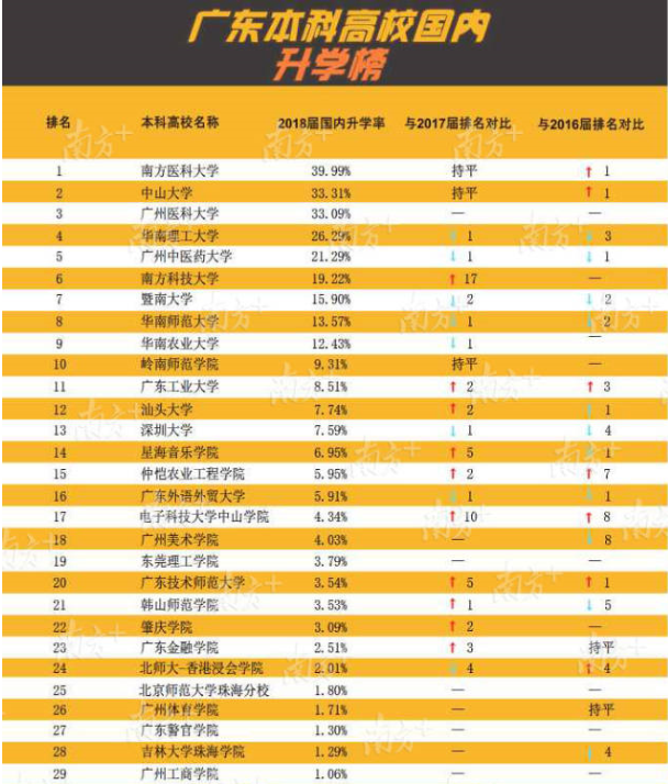 在發(fā)布“薪酬榜”后(點(diǎn)擊查看“薪酬榜”),今天南方教育智庫繼續(xù)獨(dú)家推出廣東高?!吧龑W(xué)榜”,梳理全省123所高校發(fā)布的《2018年畢業(yè)生就業(yè)質(zhì)量年度報(bào)告》的關(guān)鍵數(shù)據(jù),聚焦畢業(yè)生的深造路徑和升學(xué)比例。其中南方醫(yī)科大學(xué)、中山大學(xué)、廣州醫(yī)科大學(xué)本科畢業(yè)生國內(nèi)升學(xué)率位列前3名,均超過33%。