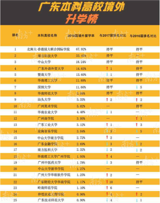 廣東外語外貿(mào)大學(xué)境外留學(xué)人數(shù)顯著提升,2018屆共有275人升入世界排名前100名的高校深造。兩所內(nèi)地與香港合作創(chuàng)辦的大學(xué)在境外留學(xué)率上處于全省前列。北京師范大學(xué)-香港浸會(huì)大學(xué)聯(lián)合國際學(xué)院持續(xù)多年保持全省第1位,此次共有811人留學(xué),其中481人就讀世界前100名的大學(xué)。香港中文大學(xué)(深圳)僅公布總升學(xué)率65.67%,該校就業(yè)處相關(guān)負(fù)責(zé)人介紹,升學(xué)率中絕大部分是境外留學(xué),176名學(xué)生平均每人收到3份世界知名大學(xué)錄取通知書。