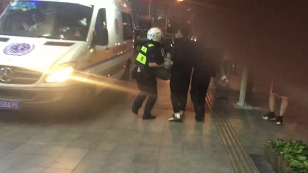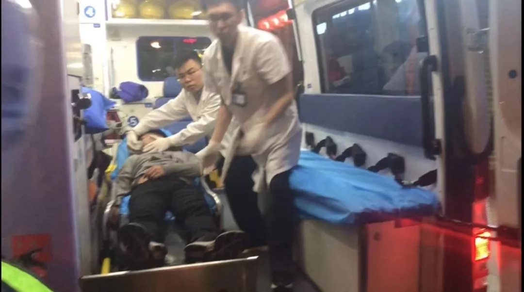 救護車趕到現(xiàn)場,隊員們爭分奪秒將男子抬上救護車。