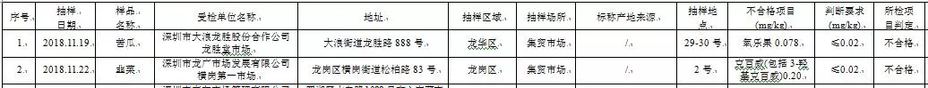 此次監(jiān)測蔬菜63品份,其中2份樣品農殘超標,不合格樣品抽樣位點是:龍華區(qū)大浪街道龍勝路888號龍勝堂市場29-30號檔和龍崗區(qū)橫崗街道橫崗第一市場2號檔。