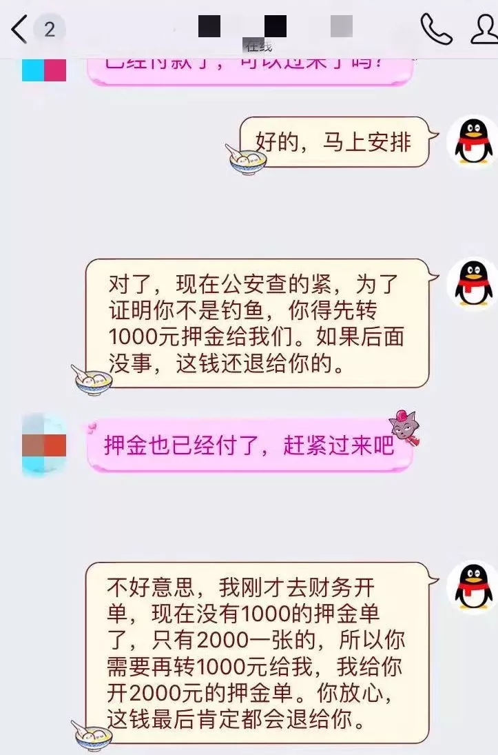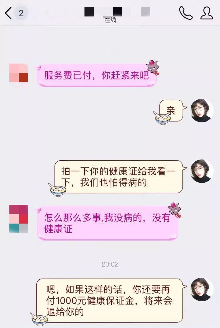 轉(zhuǎn)賬后,小李同學到一酒店開好房間,靜等“小妹”上門,但此時,對方要求再交1000元“風險押金”才能安排“小妹”過來。