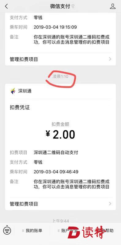 5日中午,記者再次使用“深圳通+”小程序支付車費,掃碼后隨即收到一條“1.6元”的付款信息,過了不到5分鐘又收到了一條“1.6元”的扣費信息,但乘車時間顯示為“3月4日”。這是否是重復(fù)扣費呢?