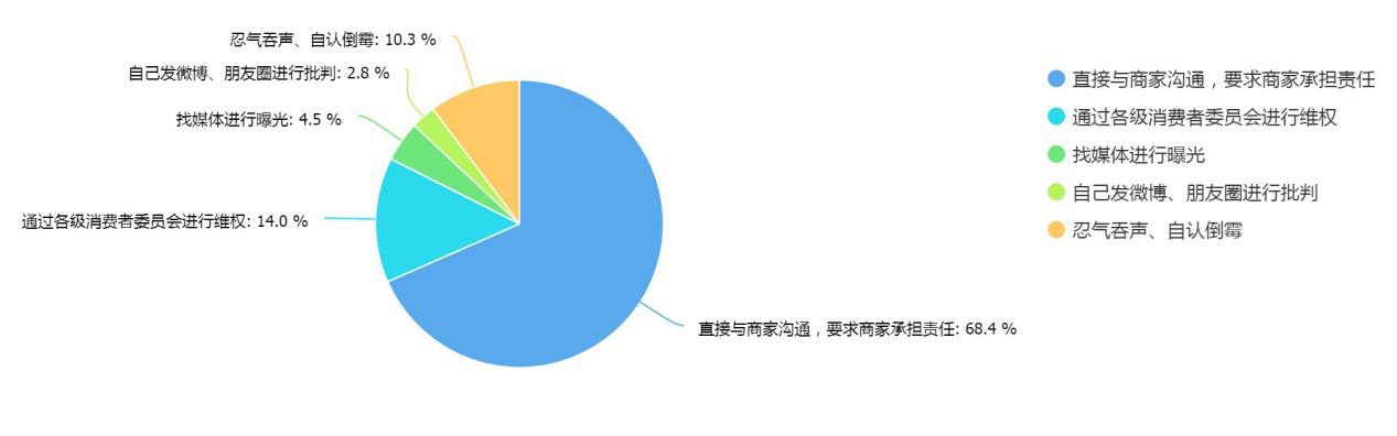有68.4%的受訪者在遇到消費(fèi)侵權(quán)后選擇直接與商家溝通,要求商家承擔(dān)責(zé)任,10.4%的受訪者會選擇忍氣吞聲、自認(rèn)倒霉;其中男性消費(fèi)者更傾向于找媒體曝光,而女性消費(fèi)者則傾向于忍氣吞聲。