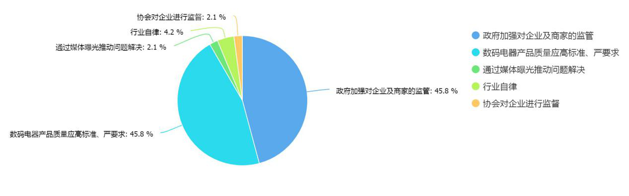 針對目前數(shù)碼家電行業(yè)中存在的相關(guān)問題,有45.8%的消費(fèi)者建議通過政府加強(qiáng)對企業(yè)及商家的監(jiān)管,另有部分網(wǎng)民建議數(shù)碼家電類產(chǎn)品應(yīng)該設(shè)立更高的的標(biāo)準(zhǔn),對企業(yè)應(yīng)該提出更高的要求。