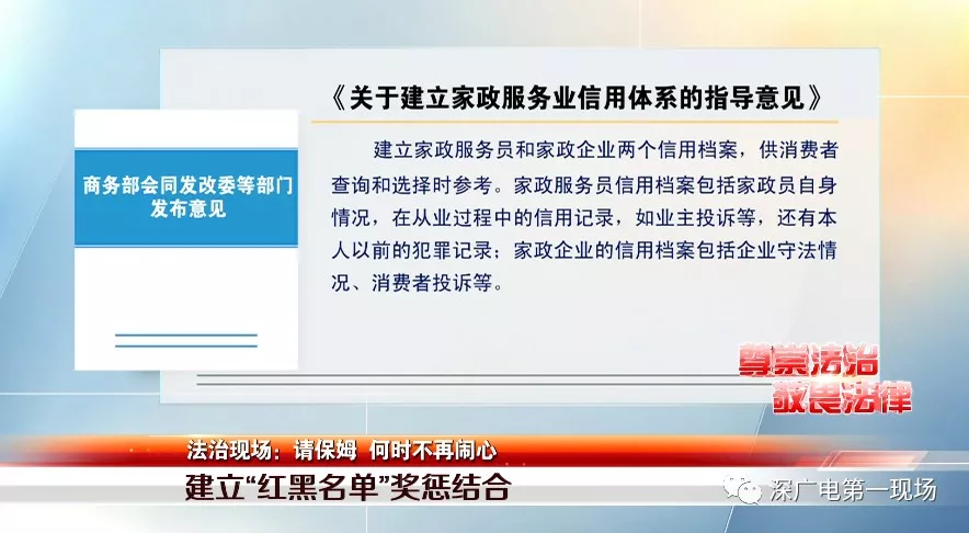 趙坤:在深圳,請(qǐng)保姆,育嬰師,鐘點(diǎn)工等等是很多家庭的剛需,但是很多人也抱怨說(shuō),要請(qǐng)個(gè)好的保姆阿姨實(shí)在是太難了,有些雇主因?yàn)楦鞣N原因家里來(lái)來(lái)去去換了好幾個(gè)阿姨,有些甚至還跟家政公司調(diào)解不成鬧上了法庭。防患于未然,商務(wù)部等部委這次發(fā)布的意見,建立信用檔案,可謂來(lái)的正當(dāng)時(shí)。我們也期待深圳能盡快出臺(tái)家政行業(yè)信用平臺(tái),期待深圳的家政行業(yè)能更加透明,更加規(guī)范。