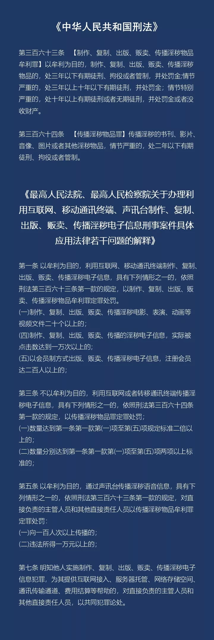 我國(guó)《刑法》規(guī)定了對(duì)傳播淫穢物品牟利罪、傳播淫穢物品罪的處罰,而最高法、最高檢2004年9月出臺(tái)的《關(guān)于辦理利用互聯(lián)網(wǎng)、移動(dòng)通信終端、聲訊臺(tái)制作、復(fù)制、出版、販賣(mài)、傳播淫穢電子信息的刑事案件具體應(yīng)用法律若干問(wèn)題的解釋》,又對(duì)此類犯罪認(rèn)定做了詳細(xì)的解釋。
