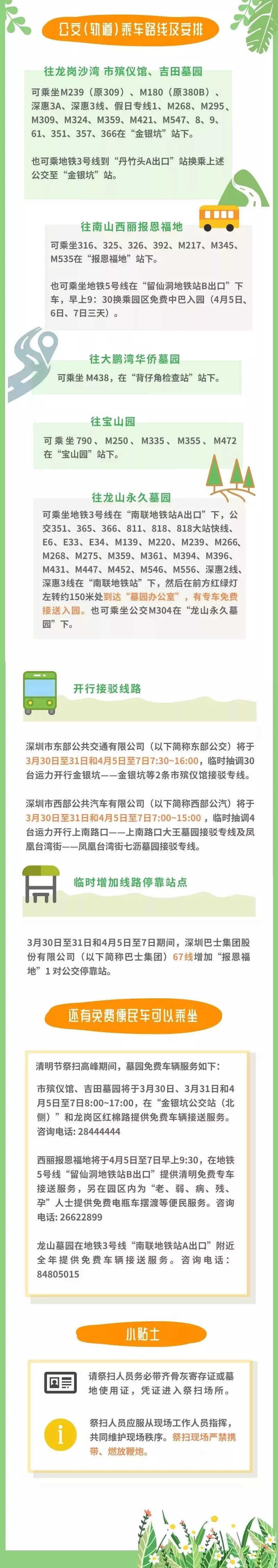交警部門將視情況對上述地點進行交通管制,為滿足市民朋友出行祭掃需要,除了給大家準備出行指引外還將開行墓園接駁專線、增加??空尽⒃黾舆\力請大家文明出行、綠色出行。