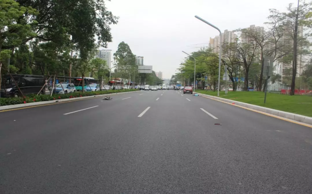 案發(fā)現(xiàn)場位于寶安區(qū)寶安大道新安街道中糧卡羅社區(qū)路段,南往北主道路寬13.72米,該路段設(shè)立有輔道及非機動車道。瀝青路面,照明條件為白天,交通信號方式為標(biāo)志、標(biāo)線。