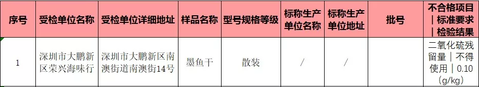 水產(chǎn)品有1批次檢出不合格,不合格樣品為墨魚干,不合格項目為二氧化硫殘留量。