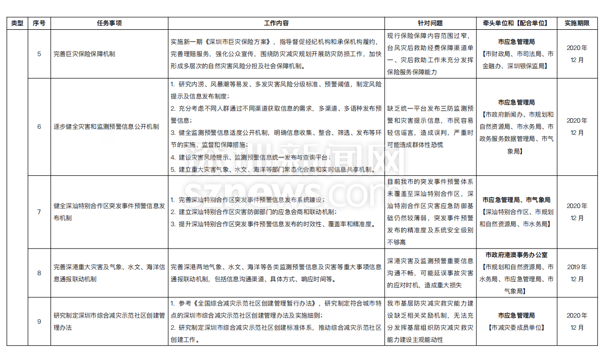 同時(shí),還將建立災(zāi)害天氣道路交通管制機(jī)制、健全完善三防應(yīng)急預(yù)案體系等,并在2019年12月前開始實(shí)施;健全避難場(chǎng)所救助保障機(jī)制、完善巨災(zāi)保險(xiǎn)保障機(jī)制、健全深汕特別合作區(qū)突發(fā)事件預(yù)警信息發(fā)布機(jī)制等,在2020年12月前開始實(shí)施。所有體制機(jī)制都由主要責(zé)任單位負(fù)責(zé)牽頭,相關(guān)單位配合建立實(shí)施。