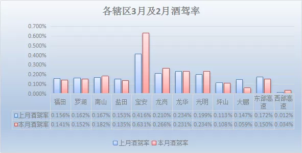 按轄區(qū)進行劃分:3月酒駕率最高為寶安0.631%,其次是龍崗0.266%、光明0.234%。