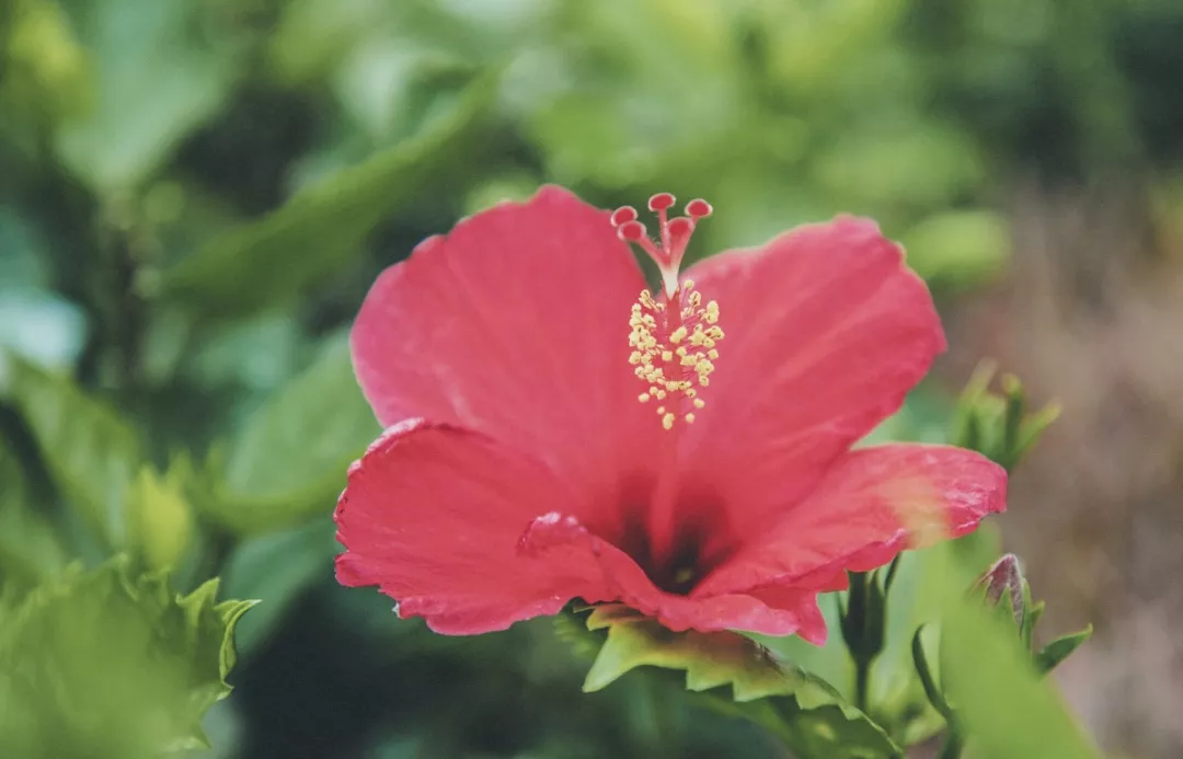 朱槿,也稱扶桑,是常見的觀賞性植物,在溫暖的南方,四季都有花開,紅艷艷的花朵掛在枝頭,非常惹人喜愛。因?yàn)榛ǘ涠鄶?shù)大而紅,所以大家還給它起了一個(gè)淺顯易懂的俗名——大紅花。