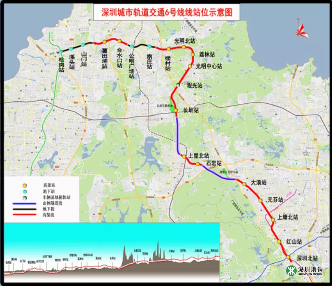 深圳地鐵6號線一期工程全長約49.4km,其中一期工程長約37.6km,起自深圳北站綜合交通樞紐,終止于松崗站,設車站20座(其中地下站5座,高架站15座),與4、5、11、13、15號線及廣深港客運專線綜合換乘。