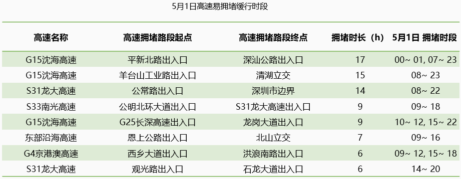 高德地圖、中國旅游協(xié)會、中國氣象局中國天氣網(wǎng)聯(lián)合全國90多家交通管理部門另發(fā)報告指出,5月1日出行全國高速易擁堵路段中,G15沈海高速深圳段(排榜立交-惠鹽荷坳收費站北3km)名列全國第三。