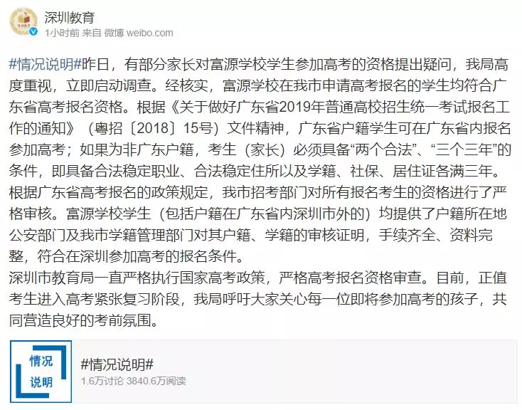 該回應(yīng)稱:經(jīng)核實(shí),富源學(xué)校學(xué)生均提供了戶籍所在地公安部門及我市學(xué)籍管理部門對(duì)其戶籍、學(xué)籍的審核證明,手續(xù)齊全、資料完整,符合在深圳參加高考的報(bào)名條件。