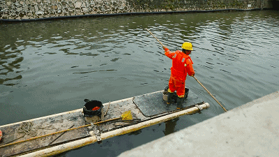 耐心清理河面上細小的垃圾