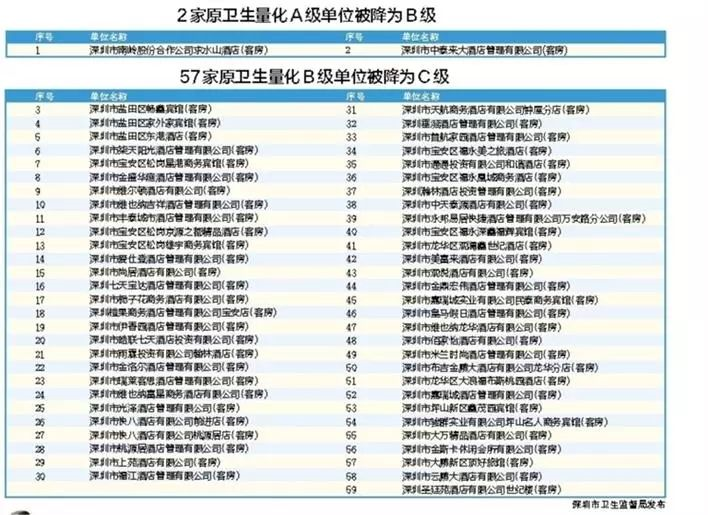 5、深圳市衛(wèi)生監(jiān)督部門自2018年12月開始集中開展專項整治行動。截至目前,行動中共檢查1660家酒店業(yè)單位,責(zé)令限期整改224家,立案95宗,共有59家單位在衛(wèi)生信譽等級評定復(fù)審工作中被予以“降級”,其中不乏部分知名連鎖酒店業(yè)單位。