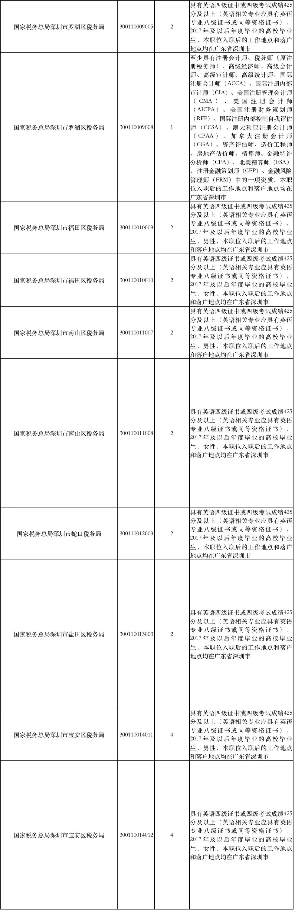 國家稅務(wù)總局深圳市稅務(wù)局補(bǔ)充錄用職位簡表: