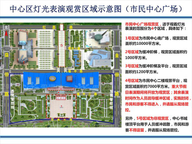 ▲中心區(qū)燈光表演觀賞區(qū)域示意圖(含市民中心廣場(chǎng)和蓮花山公園)