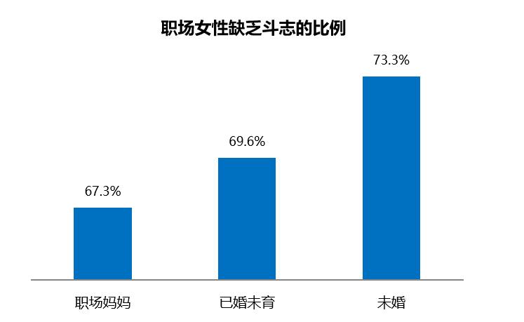盡管來自生活和事業(yè)的雙重壓力較大,但是職場(chǎng)媽媽的職場(chǎng)斗志依然高昂。調(diào)查顯示,整體來看職場(chǎng)女性不加班的比例不足三成,職場(chǎng)媽媽群體的加班強(qiáng)度略僅低于其他女性職場(chǎng)人,有31.1%的職場(chǎng)媽媽不用加班。雖然職場(chǎng)的外部競(jìng)爭(zhēng)環(huán)境壓力大,但職場(chǎng)媽媽奮斗拼搏的精神氣很高。調(diào)研顯示,職場(chǎng)媽媽"經(jīng)常或偶爾出現(xiàn)缺乏工作斗志"的比例最低,為67.3%;已婚未育排在次位;未婚女性人群中缺少斗志的占比高達(dá)73.3%。