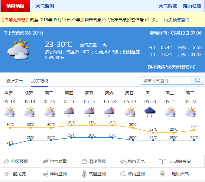 深圳新聞網(wǎng)2019年5月13日訊 深圳今日氣溫23-30℃,多云間陰天。市氣象臺預(yù)測,未來一周天氣持續(xù)炎熱,最高氣溫可達30-31 ℃。具體13-15日多云間晴天,早晚有輕霧,天氣炎熱,16-19日多云,部分時間有雷陣雨,中午前后天氣炎熱。