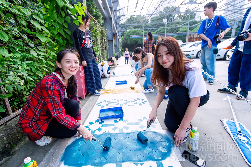 志愿者在協(xié)助創(chuàng)作《安全地帶》花磚涂鴉作品(主辦方供圖)