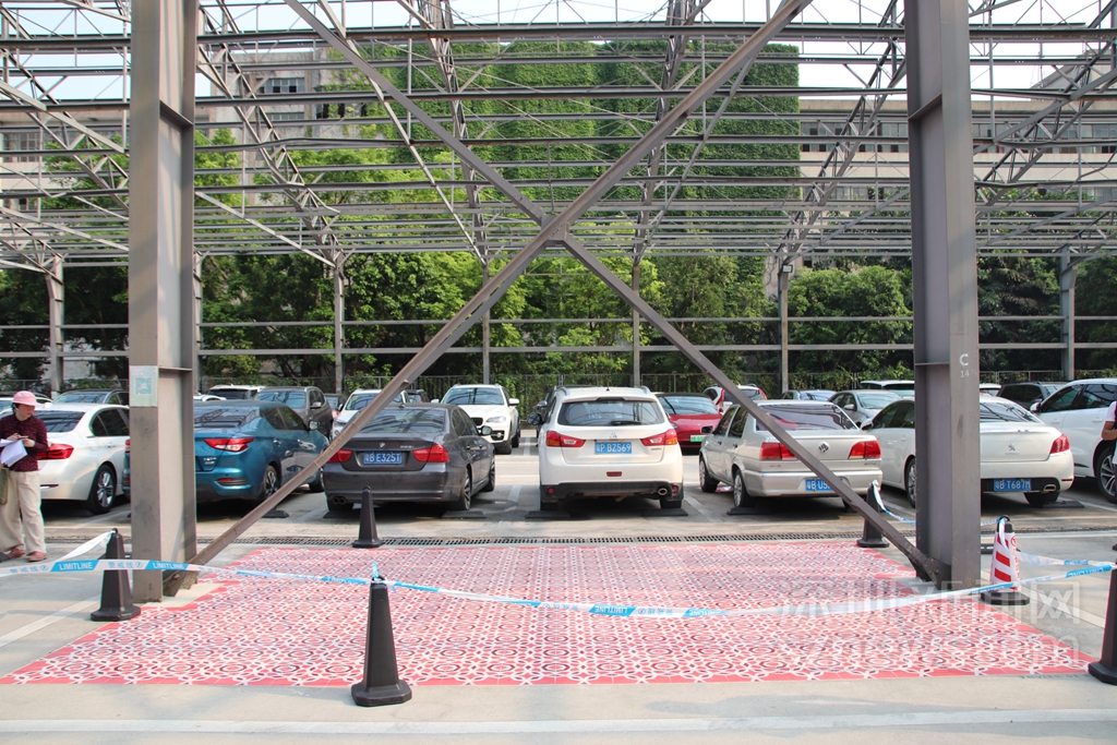 公共空間中明亮的、規(guī)則的色彩往往讓行人眼前一亮。西班牙視覺藝術家Javier de Riba帶來花磚涂鴉作品《安全地帶》,用彩色油漆仿制瓷磚的質(zhì)感進行創(chuàng)作,通過規(guī)則、反復的美好圖案,增加公共停車區(qū)域的家園感和安全感。這一作品還在開幕前開展工作坊,邀請公眾和志愿者一同參與完成。