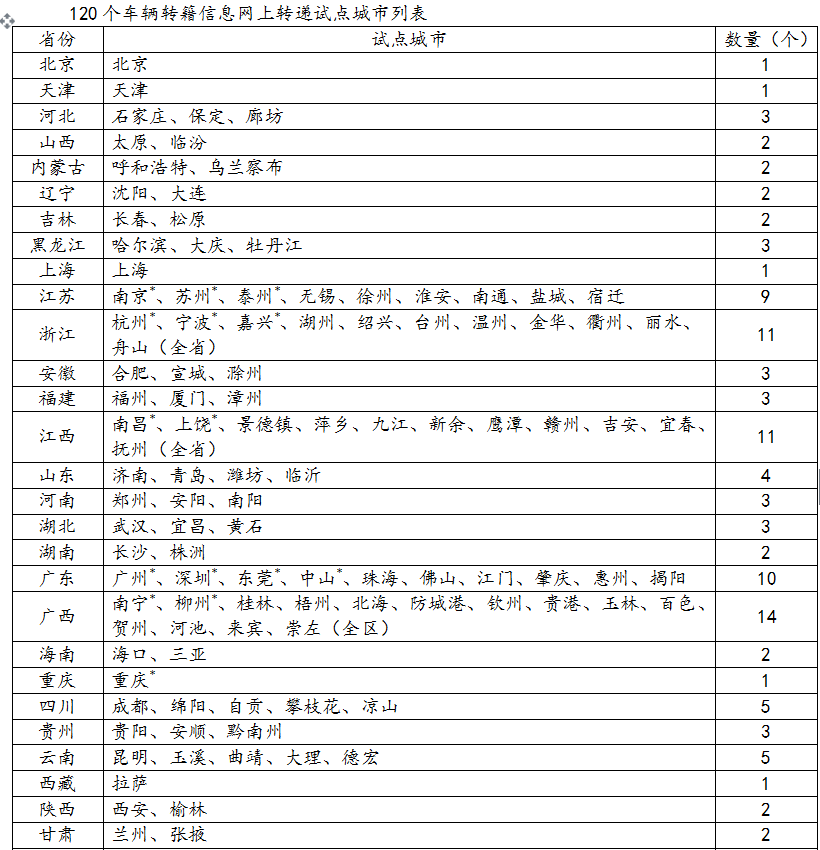 4.擴大車輛轉(zhuǎn)籍信息網(wǎng)上轉(zhuǎn)遞試點。在原有15個試點城市的基礎(chǔ)上,進一步擴大非營運小微型載客汽車檔案電子化網(wǎng)上轉(zhuǎn)遞試點,在直轄市、省會市、自治區(qū)首府市、計劃單列市全部推行,同時各省(區(qū))至少再選擇1至2個城市推行。對機動車在試點城市之間轉(zhuǎn)籍的,申請人可以直接到車輛遷入地車輛管理所申請并辦理,無需再回遷出地驗車、提取紙質(zhì)檔案。