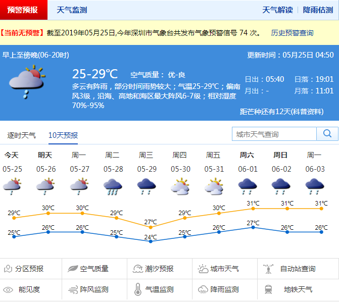 深圳市氣象臺提醒市民,未來三天有短時陣雨,市民出行須注意攜帶雨具;沿海和高地陣風較大,市民到海邊游玩須注意防范。此外,近期強降雨風險較高,降雨局地性明顯,市民需要注意防范局地強降雨、雷暴及地質(zhì)災害等次生災害。