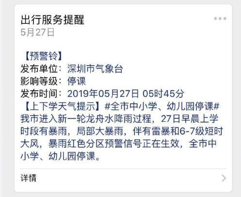 5月27日5時(shí)45分,深圳天氣微信公眾號(hào)發(fā)布出行服務(wù)提醒:深圳進(jìn)入新一輪龍舟水降雨過程,27日早晨上學(xué)時(shí)段有暴雨,局部大暴雨,暴雨紅色預(yù)警信號(hào)正在生效全市中小學(xué)、幼兒園停課。