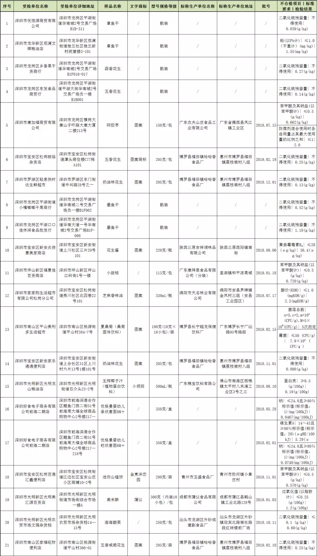 本次共抽檢流通環(huán)節(jié)食品2455批次,涉及流通環(huán)節(jié)經(jīng)營主體870家次,共檢測食品指標14705項次。其中檢出不合格樣品21批次,涉及不合格食品類別有炒貨食品及堅果制品6批次,食用油、油脂及其制品1批次,蔬菜制品1批次,薯類和膨化食品1批次,水產(chǎn)制品4批次,水果制品3批次,特殊膳食食品2批次,調(diào)味品1批次,飲料2批次;涉及不合格項目類別為金屬等元素污染、微生物污染、食品添加劑、品質(zhì)指標、生物毒素污染。