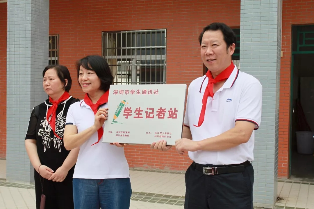 在捐贈儀式上,同學(xué)們?yōu)檫h(yuǎn)道而來的叔叔阿姨系上了紅領(lǐng)巾,這些“大紅領(lǐng)巾”陪著“小紅領(lǐng)巾”,提前歡慶六一兒童節(jié)的到來??偵邕€為雅色的孩子帶來一份大禮,那就是深圳學(xué)通社學(xué)生記者站在頌平小學(xué)掛牌。