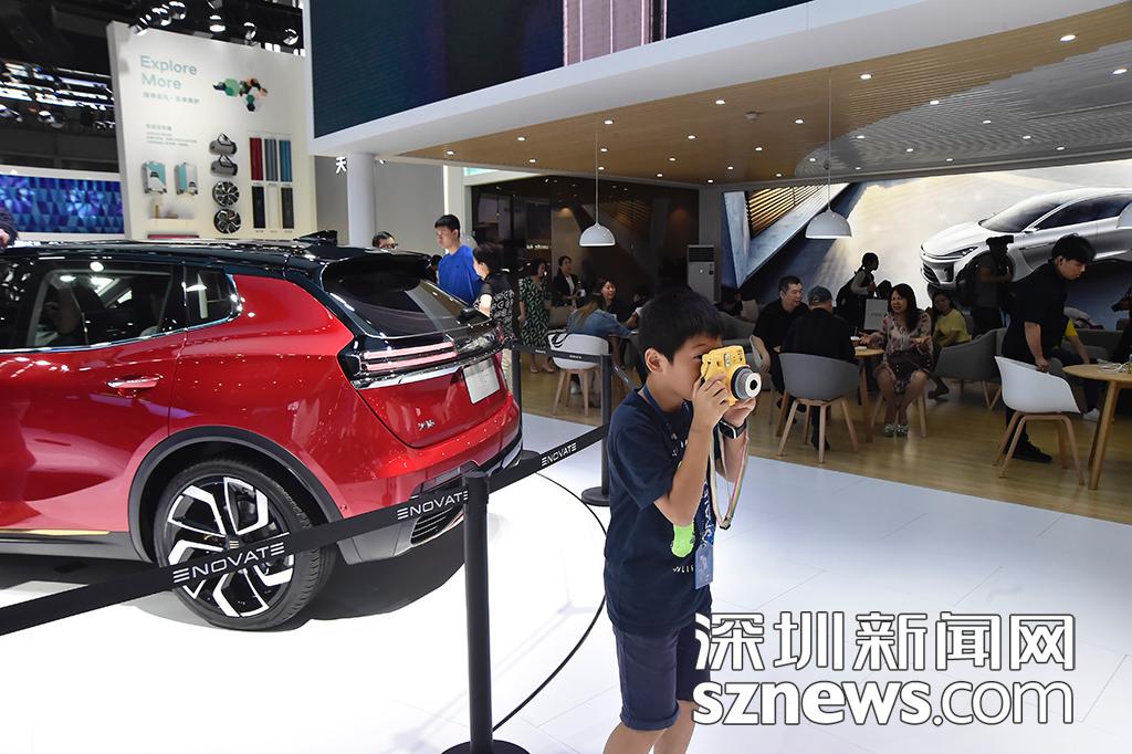 車展現(xiàn)場(chǎng),一位小攝影師拿起相機(jī)拍攝
