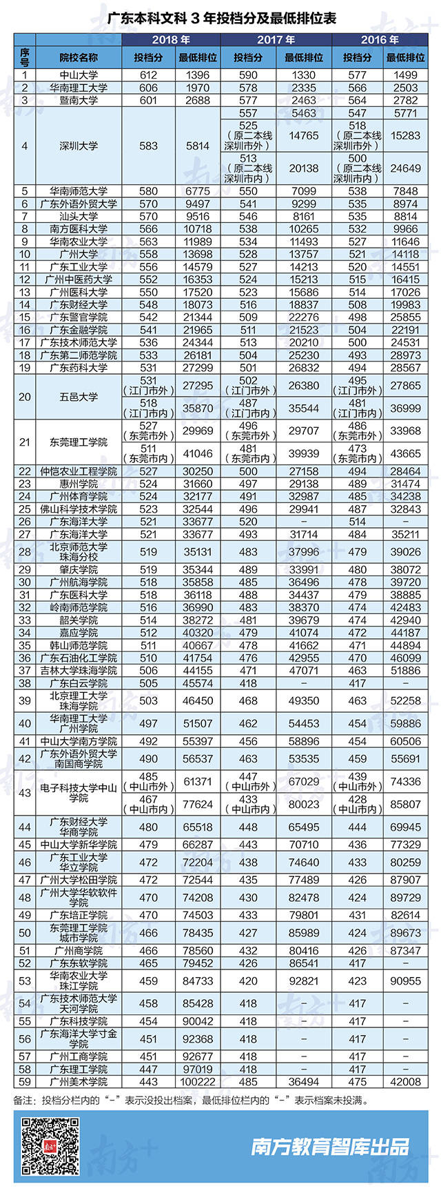總體來看,廣東文科專業(yè)招生數(shù)量相對穩(wěn)定,且一些不適應(yīng)社會發(fā)展的文科專業(yè)正逐步調(diào)整,因此2018年文科一半以上的高校最低排位較2017年上升,文科生要考個好大學,需要更努把力了。例如華南理工大學、華南師范大學、廣州大學3所高校最低排位比去年有所提升,分別提高365、324和59。