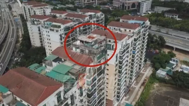 視頻中記錄的空中“碉堡”位于福田天澤花園里的一棟居民樓頂層,小高層共12層,加建的樓房遠高于樓房常規(guī)屋頂!