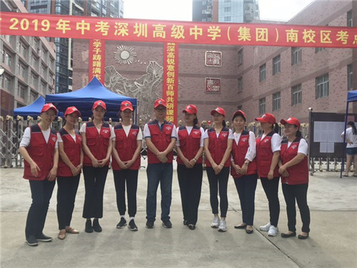 在深圳高級(jí)中學(xué)考點(diǎn)校門前,10位穿著紅色義工服的家長義工早早來到現(xiàn)場迎接考生、疏導(dǎo)人流、為考生加油。據(jù)深圳高級(jí)中學(xué)家委會(huì)會(huì)長馮女士介紹,中考期間,家委會(huì)將有數(shù)十位家長參與現(xiàn)場人流疏導(dǎo)、維持秩序,每天分為四個(gè)輪次,每科考試前后都各有10名家長義工參與。