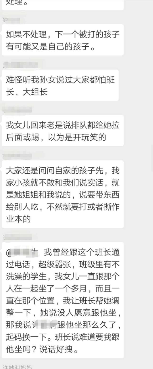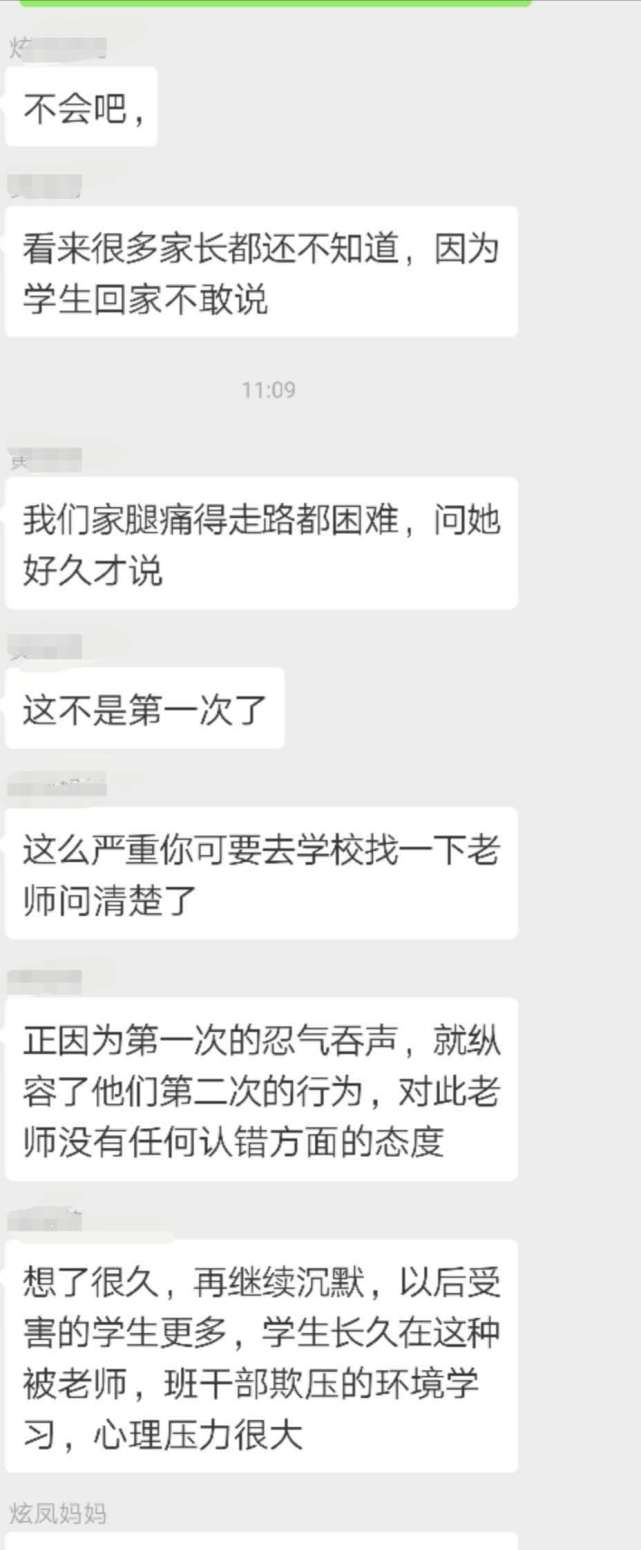 王先生把女兒的情況反映到家長(zhǎng)群里,結(jié)果群里的家長(zhǎng)紛紛表示,自己的孩子也反映當(dāng)天遭遇到班長(zhǎng)的毆打,有的孩子甚至“腿疼得難以走路”。而據(jù)孩子反映,其實(shí)類(lèi)似的毆打在班上已經(jīng)不止發(fā)生過(guò)一次。這名班長(zhǎng)是女生,平時(shí)很受班主任的信任,經(jīng)常利用班干部的權(quán)力隨意懲罰學(xué)生。“她曾經(jīng)多次要求班上同學(xué)給自己帶零食吃,不然就會(huì)被撕作業(yè)和毆打,還威脅不準(zhǔn)告訴家長(zhǎng)。”王先生稱,家長(zhǎng)們已經(jīng)將情況反映給班主任,但是班主任的反應(yīng)“相當(dāng)冷淡”,只是說(shuō)會(huì)了解一下情況。25日下午,記者電話聯(lián)系到了王先生女兒的班主任,他表示已經(jīng)就此事對(duì)班長(zhǎng)進(jìn)行了批評(píng)教育,但對(duì)于班長(zhǎng)此前多次毆打同學(xué)的行為他表示并不知情,“當(dāng)初讓這名同學(xué)做班長(zhǎng)是因?yàn)樗煽?jī)好,而且守紀(jì)律。而且我覺(jué)得,孩子之間有些矛盾很正常。”班主任說(shuō)。(記者 李東明)