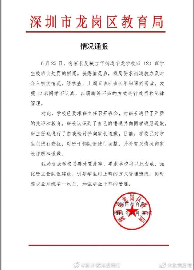 深圳新聞網(wǎng)2019年6月26日訊 近日,關(guān)于深圳一小學(xué)班長(zhǎng)對(duì)同學(xué)拳打腳踢的輿情網(wǎng)上熱傳?記者26日從龍崗區(qū)教育局獲悉,該班班長(zhǎng)確實(shí)對(duì)12名學(xué)生以踢腳等不當(dāng)方式進(jìn)行紀(jì)律管理。事情發(fā)生后,學(xué)校已對(duì)該班班長(zhǎng)進(jìn)行了嚴(yán)厲的批評(píng)教育,該班班主任也進(jìn)行自我檢討和道歉。目前,學(xué)校已對(duì)學(xué)生進(jìn)行安撫,對(duì)班干部隊(duì)伍進(jìn)行了調(diào)整。